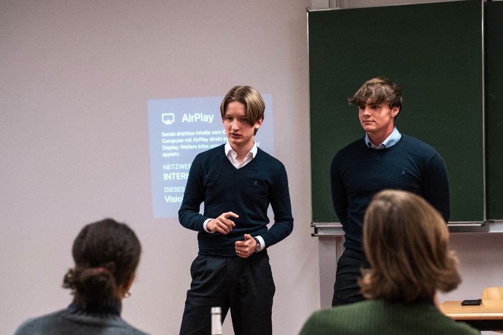 Die sieben besten Teams präsentierten ihre Projekte vor einer Jury aus Wirtschaft, Recht und Technologie. Mit klarem Alltagsbezug setzte sich in der Mittelstufe ein Duo mit einer App durch, die die Sportaktivitäten der Schule smart bündelt: Teams, Ergebnisse und Tabellen – alles auf einen Blick. In der Oberstufe überzeugte „S-Move“, ein Buchungssystem für den internatseigenen Fuhrpark. Besonders beeindruckte die Jury, dass das Tool bereits im Internatsalltag genutzt wird und damit einen direkten Mehrwert stiftet.